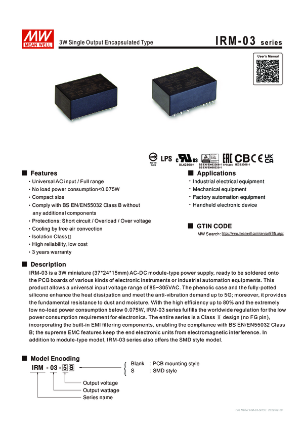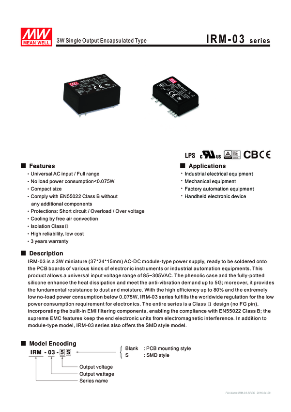 MEAN WELL IRM-03-3.3 Zasilacz AC/DC 3.3 V/DC 900 mA 3 W