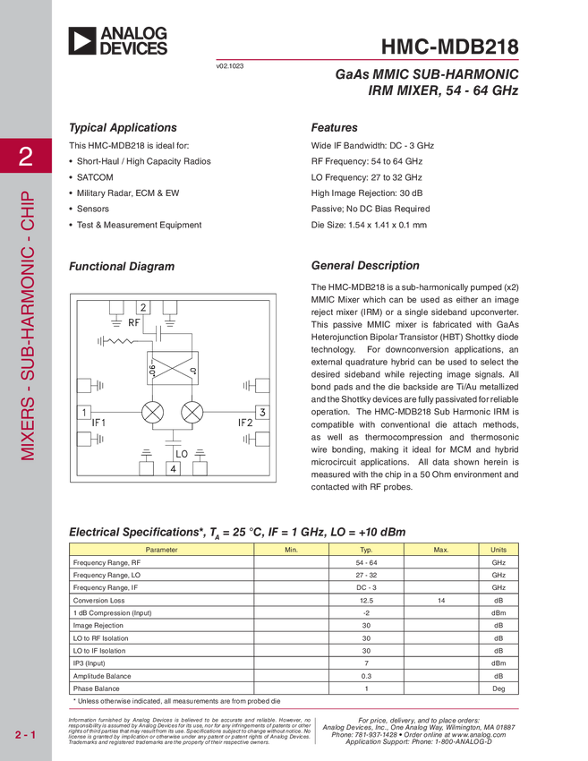 GaAs MMIC Sub-Harmonic IRM Mixer, 54 - 64 GHz