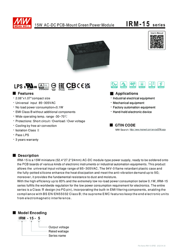 MEAN WELL IRM-15-12 Zasilacz AC/DC 12 V/DC 1.25 A 15 W