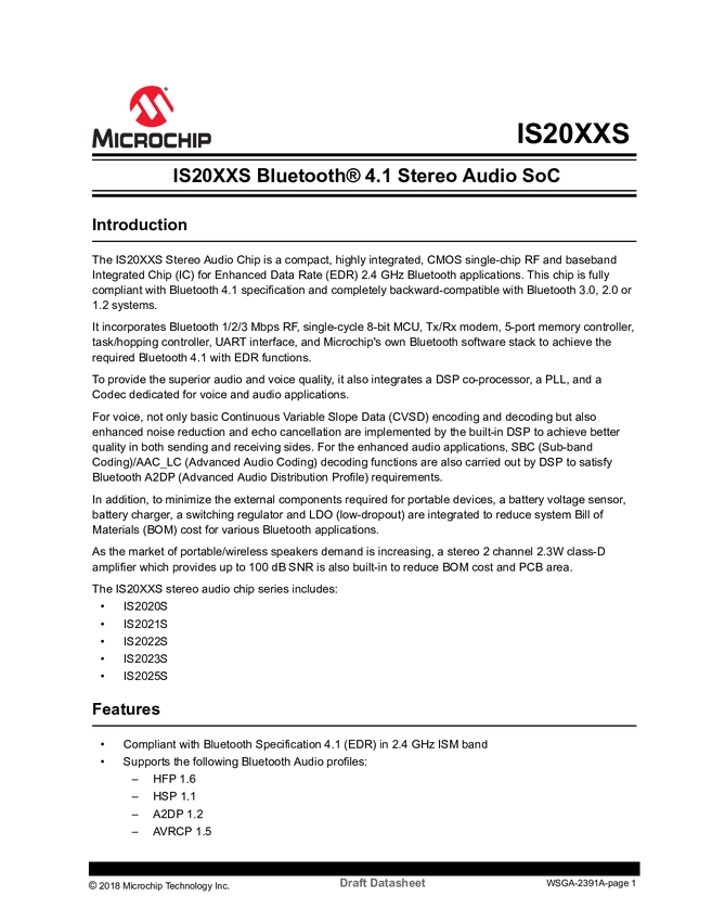 IS2083 Bluetooth Stereo Audio SoC Data Sheet