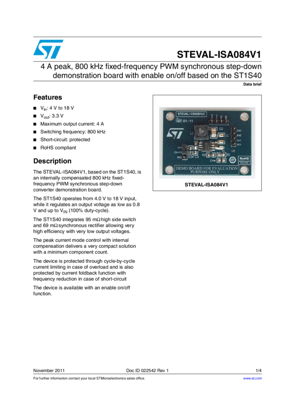 4 A peak, 800 kHz fixed-frequency PWM synchronous step-down demonstration board with enable on/off based on the ST1S40