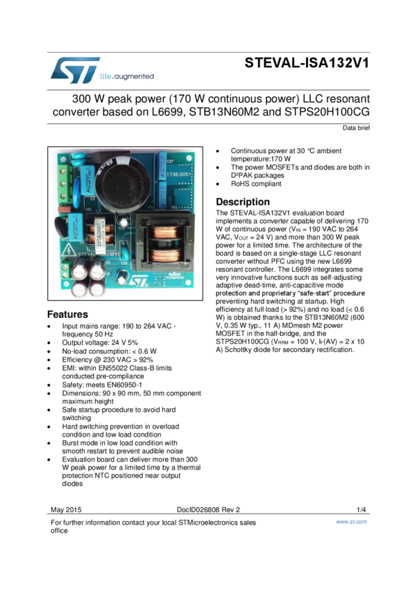 300 W peak power (170 W continuous power) LLC resonant converter based on L6699, STB13N60M2 and STPS20M80CG