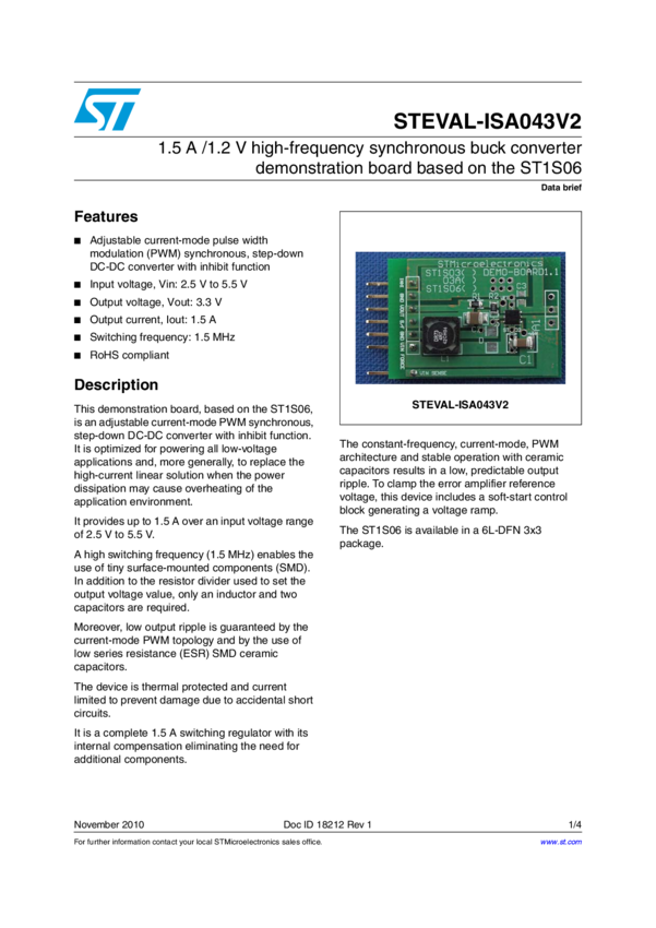 1.5 A / 3.3 V high frequency synchronous buck converter demonstration board based on the ST1S06