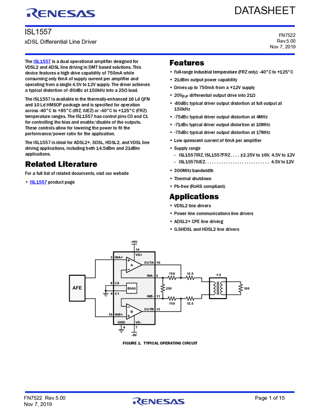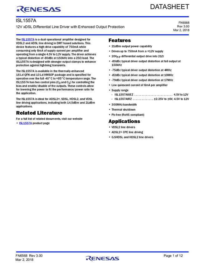 12V xDSL Differential Line Driver with Enhanced Output Protection