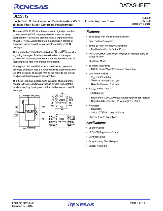 Single Push Button Controlled Potentiometer (XDCP™), Low Noise, Low Power, 16 Taps, PushButton Controlled Potentiometer