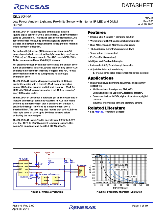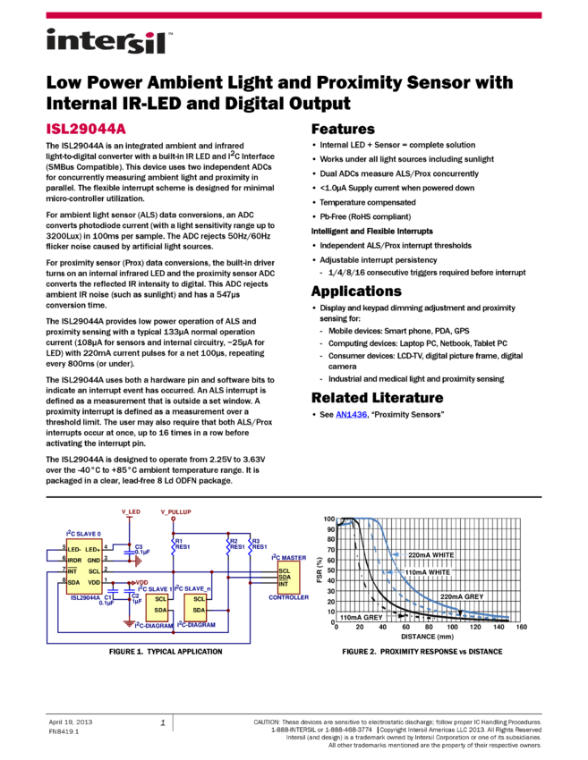 Low Power Ambient Light and Proximity Sensor with Internal IR-LED and Digital Output