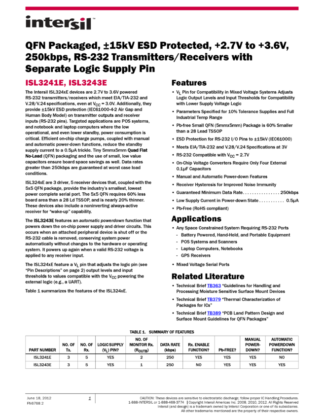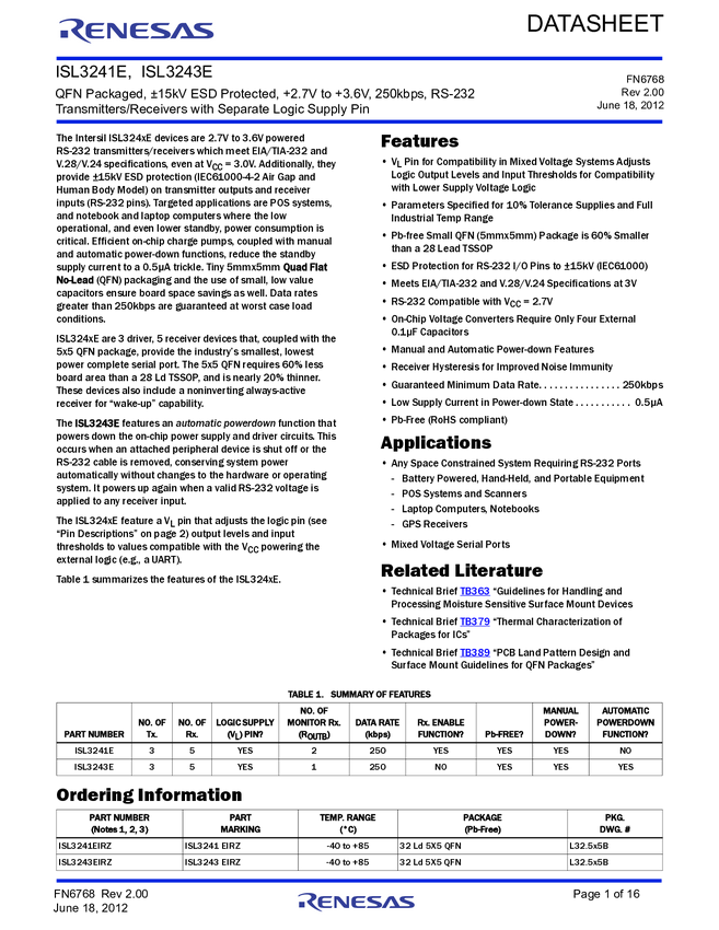 QFN Packaged, ±15kV ESD Protected, +2.7V to +3.6V, 250kbps, RS-232 Transmitters/Receivers with Separate Logic Supply Pin