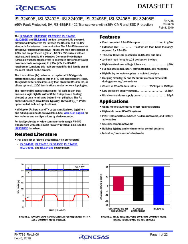 ±60V Fault Protected, 5V, RS-485/RS-422 Transceivers with ±25V CMR and ESD Protection