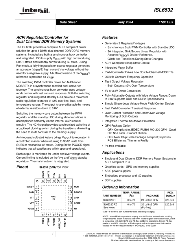 3-in-1 ACPI Regulator/Controller for Dual Channel DDR and DDR2 Memory Systems