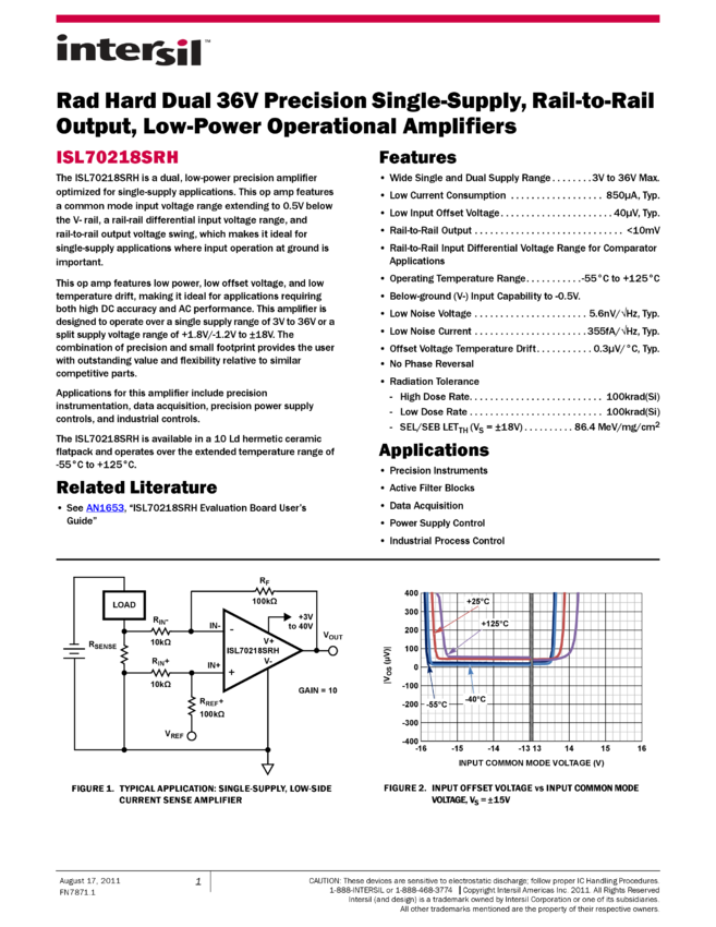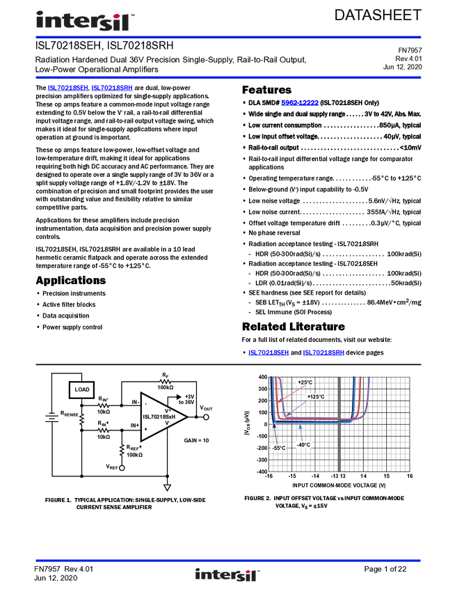 Rad Hard Dual 36V Precision Single-Supply, Rail-to-Rail Output, Low-Power Operational Amplifiers