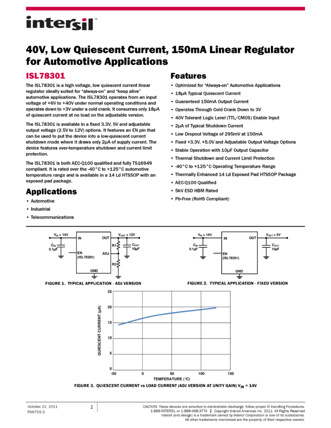 40V, Low Quiescent Current, 150mA Linear Regulator for Automotive Applications