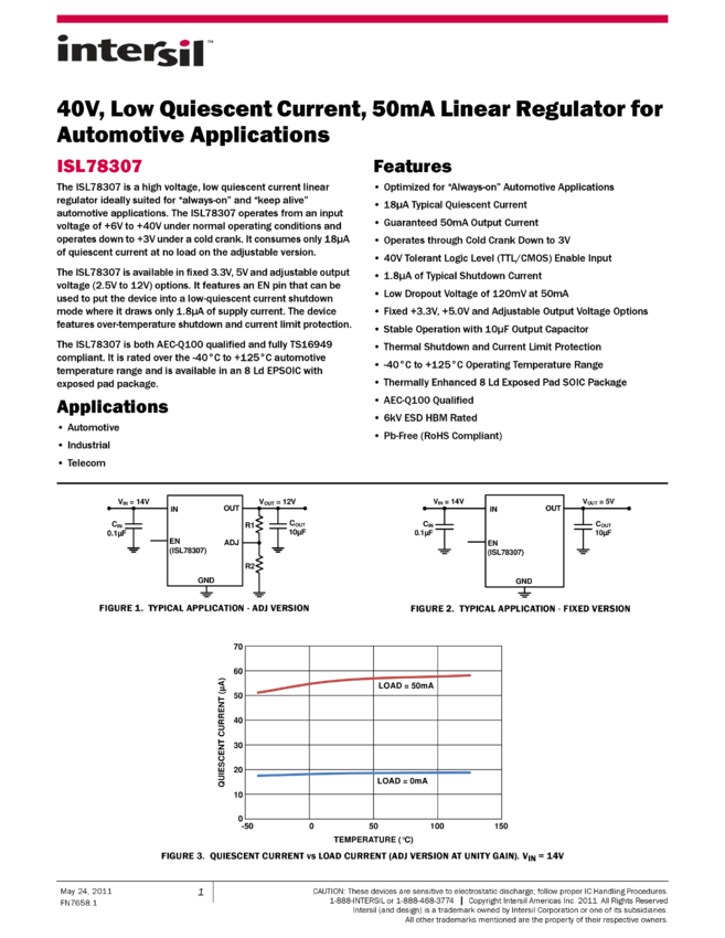 40V, Low Quiescent Current, 50mA Linear Regulator for Automotive Applications
