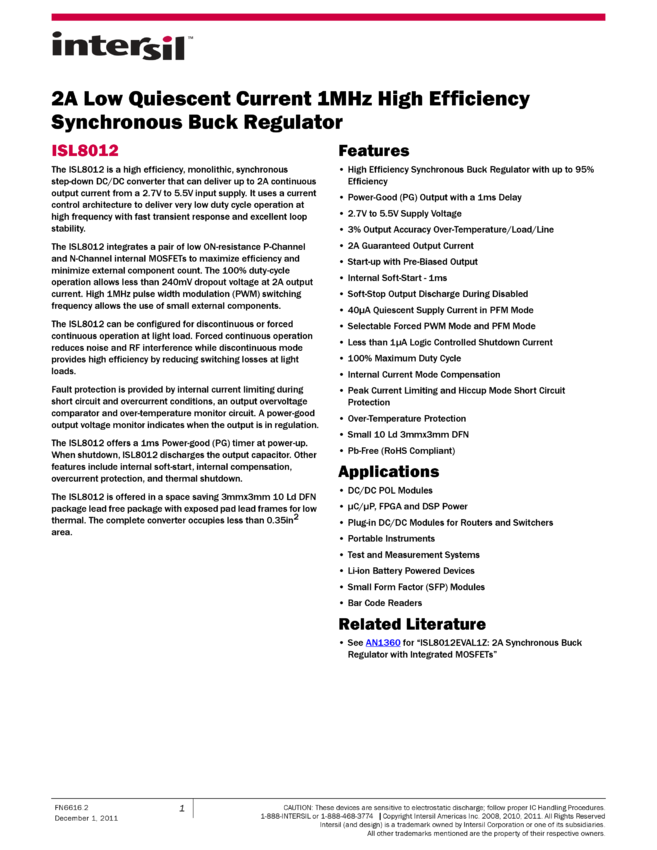 2A Low Quiescent Current 1MHz High Efficiency Synchronous Buck Regulator
