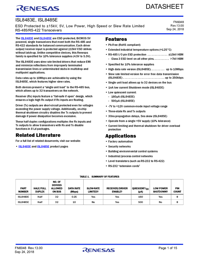 ESD Protected to ±15kV, 5V, Low Power, High Speed or Slew Rate Limited, RS-485/RS-422 Transceivers