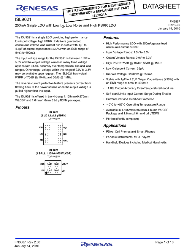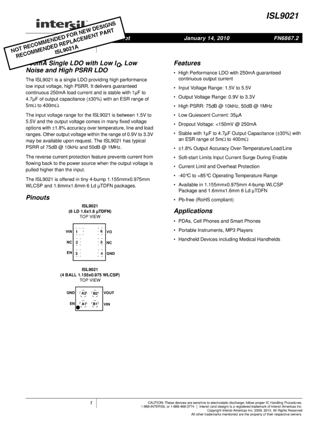 250mA Single LDO with Low I, Low Noise and High PSRR LDO