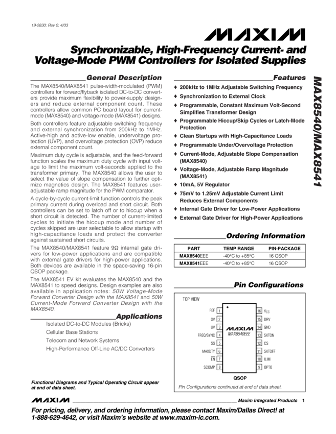MAX8540, MAX8541 Synchronizable, High-Frequency Current- and Voltage-Mode PWM Controllers for Isolated Supplies