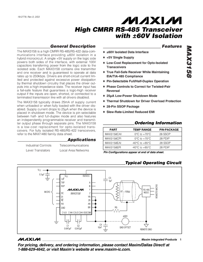 MAX3158 High CMRR RS-485 Transceiver with ±60V Isolation