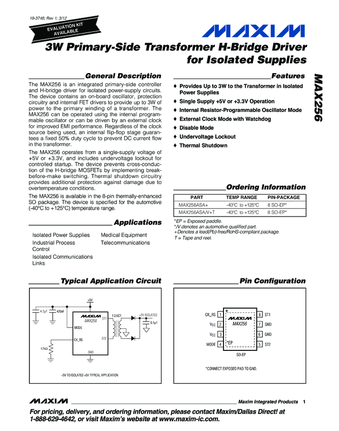 MAX256 3W Primary-Side Transformer H-Bridge Driver for Isolated Supplies