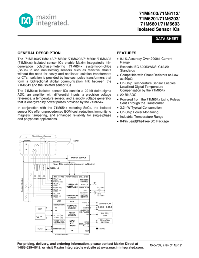 71M6103, 71M6113, 71M6201, 71M6203, 71M6601, 71M6603 Isolated Sensor ICs