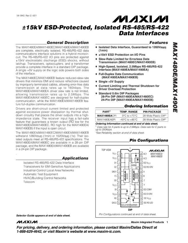 MAX1480E, MAX1490E ±15kV ESD-Protected, Isolated RS-485/RS-422 Data Interfaces