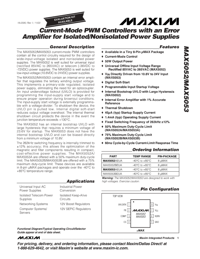 MAX5052, MAX5052A, MAX5052B, MAX5053, MAX5053A, MAX5053B Current-Mode PWM Controllers with an Error Amplifier for Isolated/Nonisolated Power Supplies