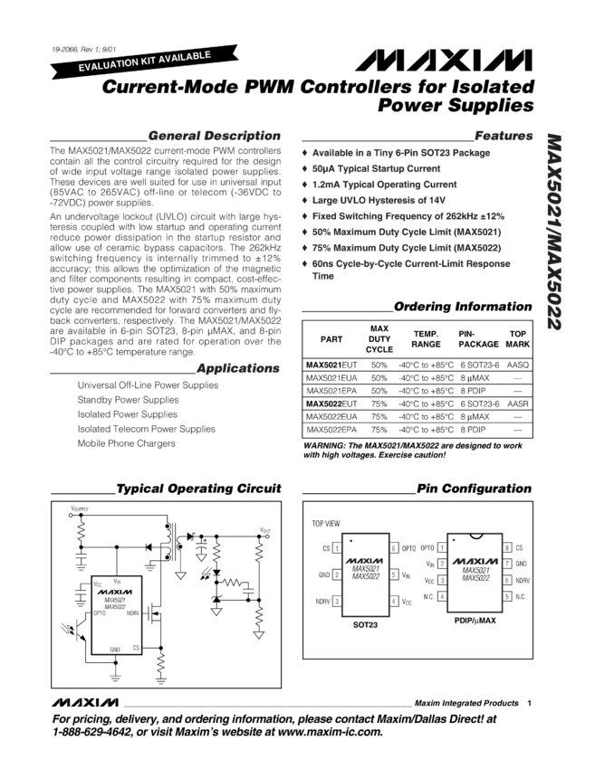 MAX5021, MAX5022 Current-Mode PWM Controllers for Isolated Power Supplies