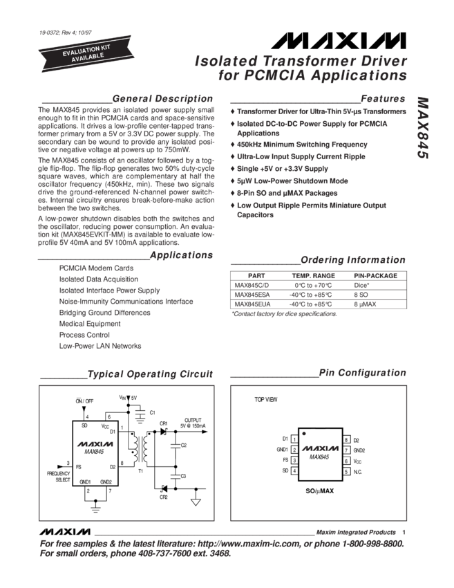 MAX845 Isolated Transformer Driver for PCMCIA Applications