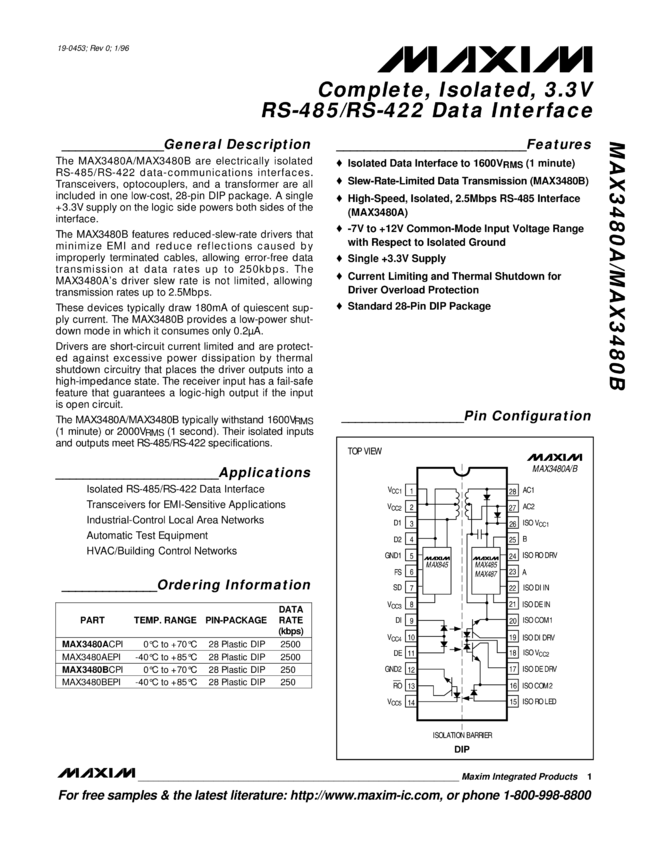 MAX3480A, MAX3480B Complete, Isolated, 3.3V RS-485/RS-422 Data Interface