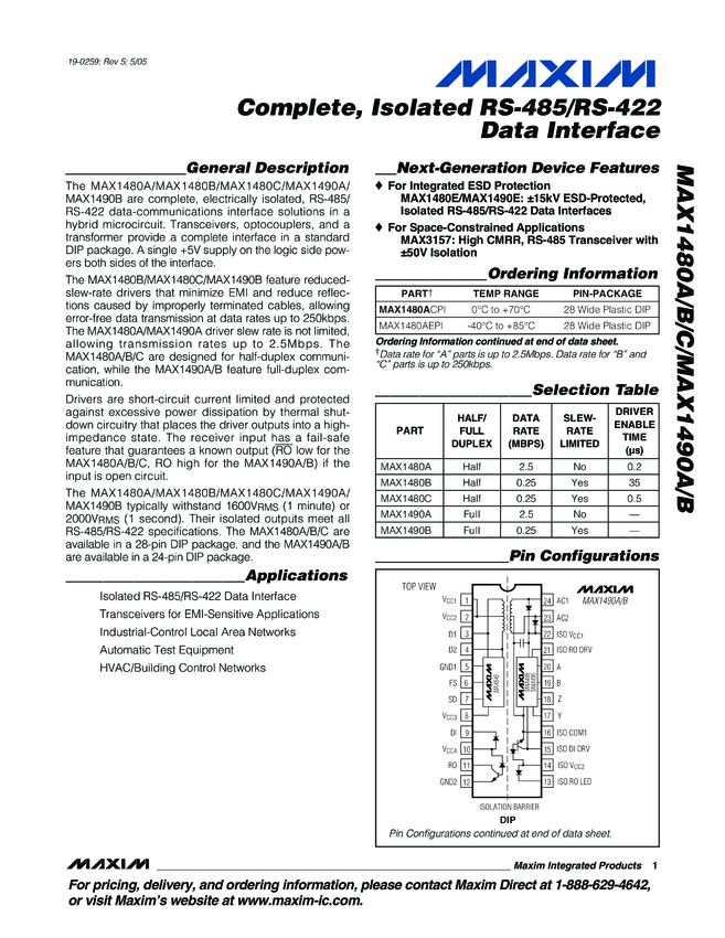 MAX1480A, MAX1480B, MAX1480C, MAX1490A, MAX1490B Complete, Isolated RS-485/RS-422 Data Interface