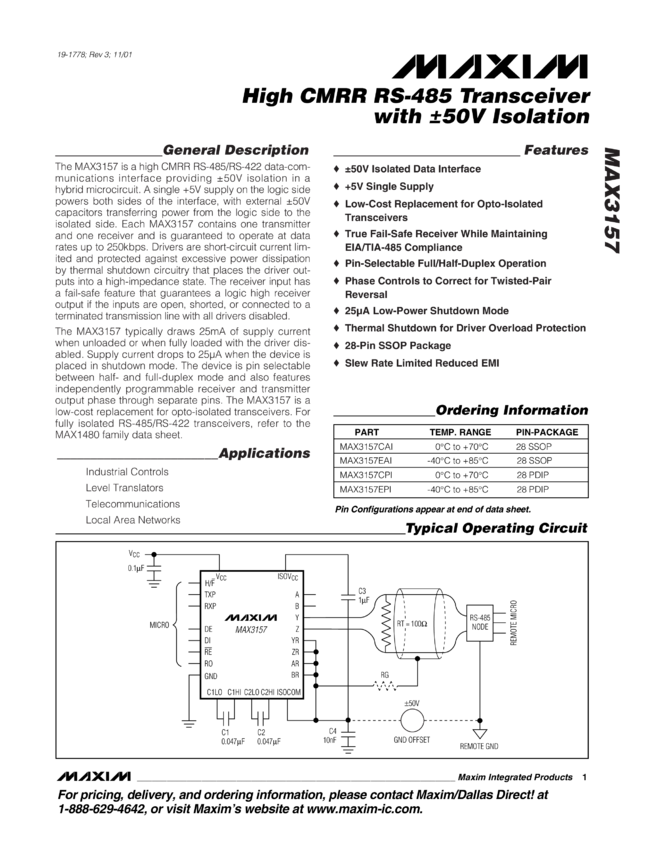 MAX3157 High CMRR RS-485 Transceiver with ±50V Isolation