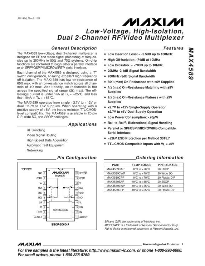 MAX4589 Low-Voltage, High-Isolation, Dual 2-Channel RF Video Multiplexer