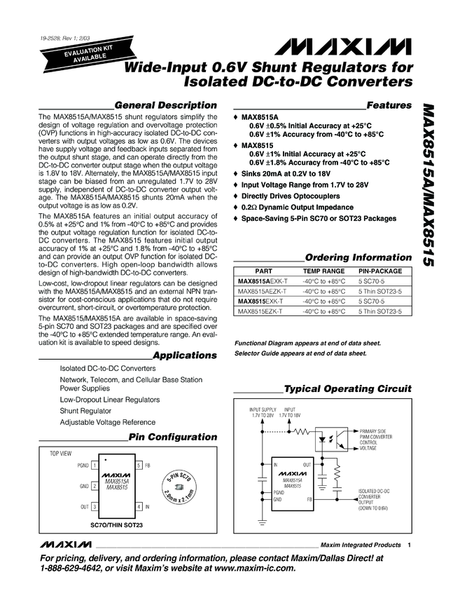 MAX8515, MAX8515A Wide-Input 0.6V Shunt Regulators for Isolated DC-DC Converters