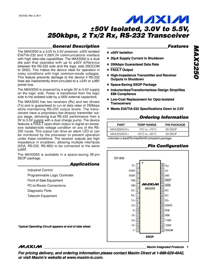 MAX3250 ±50V Isolated, 3.0V to 5.5V, 250kbps, 2 Tx/2 Rx, RS-232 Transceiver