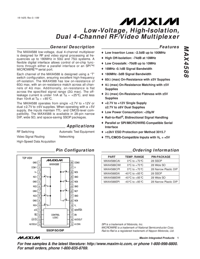 MAX4588 Low-Voltage, High-Isolation, Dual 4-Channel RF Video Multiplexer