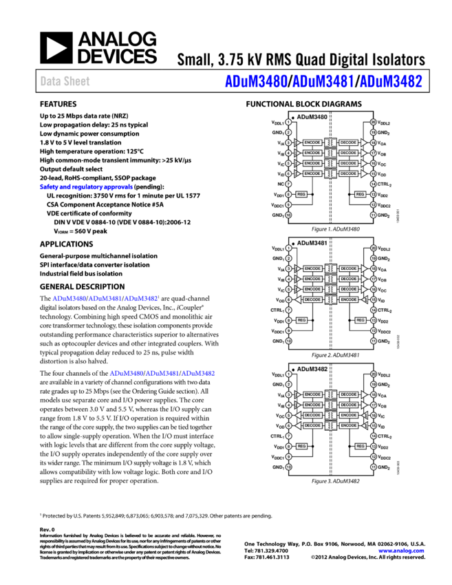 ADUM3482: Small, 3.75 kV RMS Quad Digital Isolators (2/2 Channel Directionality)