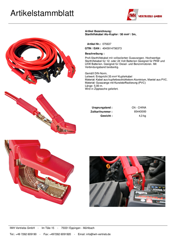 Kable rozruchowe IWH 075637, 50.0 mm², 5.00 m, aluminium (powlekane miedzią)
