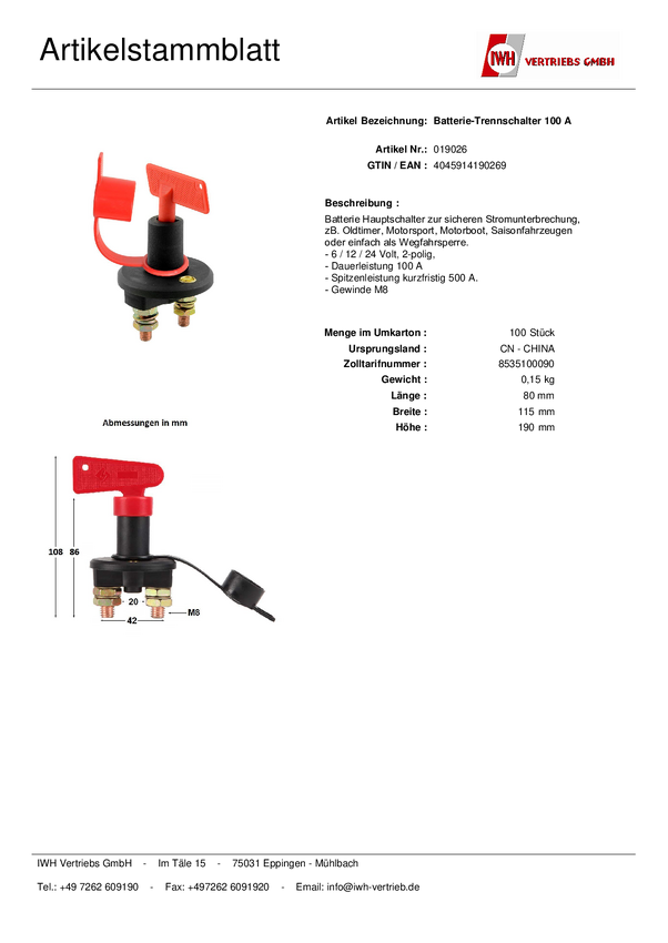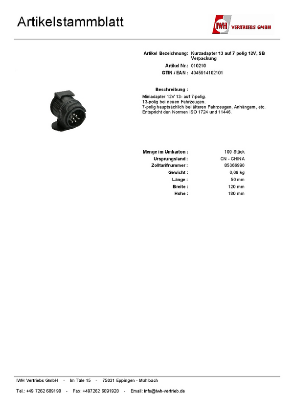 Złącze elektryczne do przyczep IWH 010210, (D x S) 180 mm x 120 mm