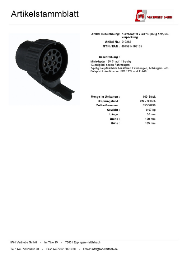 Złącze elektryczne do przyczep IWH 010212, (D x S) 180 mm x 120 mm