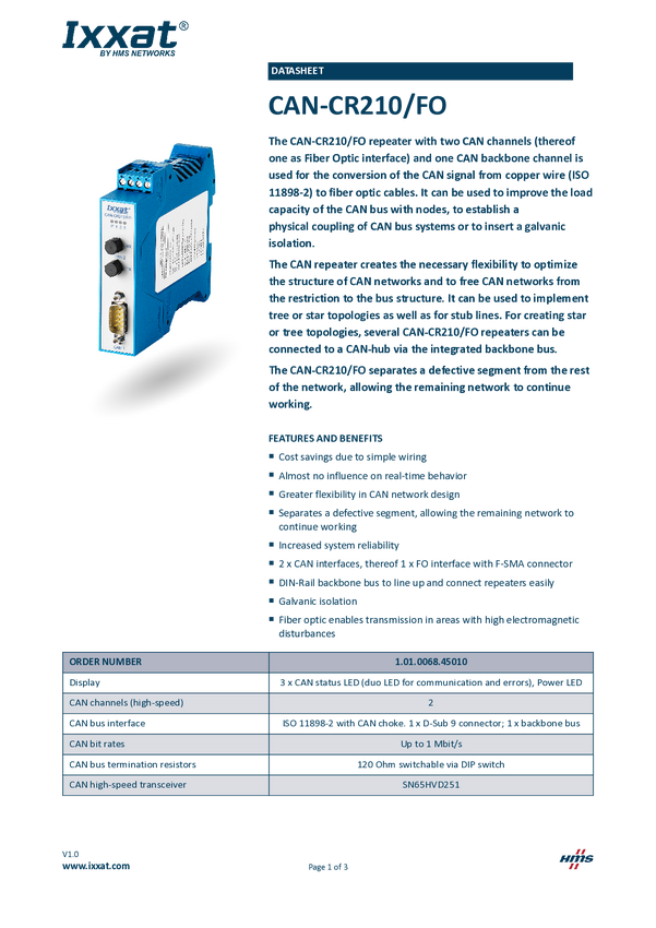 CAN FO Repeater Ixxat 1.01.0068.45010 24 V/DC