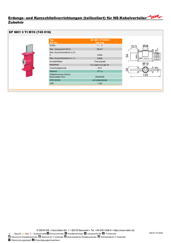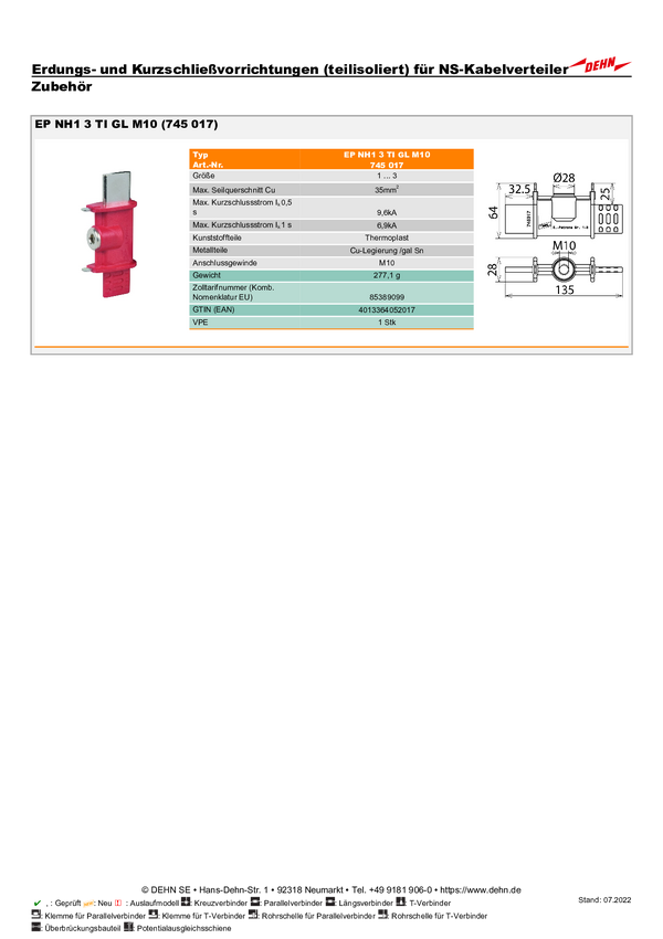 Wkładka uziemiająca (częściowo izolowana) DEHN EP NH1 3 TI GL M10