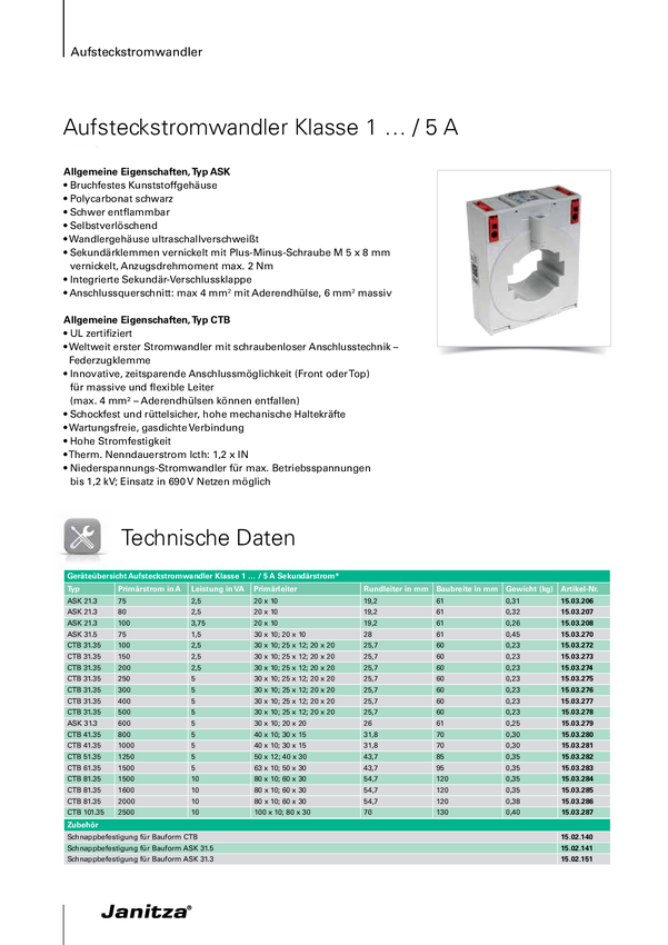 Janitza 400/5 - CTB 31.35 1503277 Wtykowy przekładnik prądowy Prąd pierwotny 400 A 1 szt.