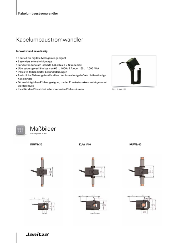 Janitza KUW1/40-125 1503321 Przekładnik prądowy do konwersji kabli Prąd pierwotny 125 A Prąd wtórny 1 A Średnica otworu: