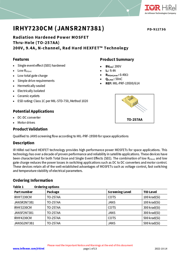 JANTXVR2N7381 is a single, rad hard N-channel MOSFET with 200V and 9.4A ratings. It is housed in a TO-257AA package and is QPL classified. With electrical performance up to 100krad(Si) TID, this R4 MOSFET provides low RDS(on), low gate charge, and fast switching and is ideal for space applications.
