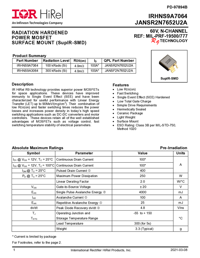 R9 N-channel MOSFET JANSR2N7652U2A in SupIR-SMD package is a high-performance, 60V and 100A rad hard device designed for space applications. It offers electrical performance up to 100krad(Si) TID and is QPL qualified. This R9 MOSFET provides improved immunity to SEE, low RDS(on), and faster switching times for increased power density and reduced power losses.