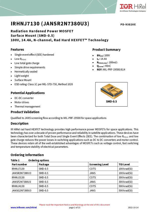 The JANSR2N7380U3 is a single N-channel MOSFET in SMD-0.5 package, with electrical performance up to 100krad(Si) TID and QPL qualification. Its rad hard R4 HEXFET technology provides reliable power MOSFETs for space applications with 100V and 9.1A ratings. Low RDS(on) and low gate charge make it ideal for DC-DC converters and motor control.