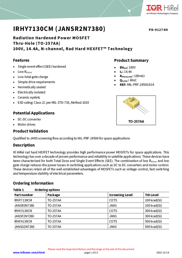 N-channel MOSFET JANTXVR2N7380 is a single, rad hard device with 100V and 14.4A ratings. It comes in a TO-257AA package and is QPL qualified. With electrical performance up to 100krad(Si) TID, this R4 MOSFET is ideal for space satellite bus and payload applications, providing low RDS(on), low gate charge, and fast switching.