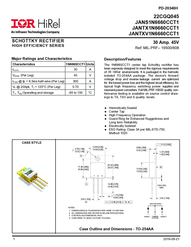 IR HiRel's JV1N6660CCT1 is a 35A 45V common cathode configuration Schottky diode in a TO-254AA package. Optimized for the lowest power loss and highest circuit efficiency in high frequency switching power supplies and resonant power converters, these diodes are reliable for space applications and other harsh environments. This device is QPL qualified and its DLA number is 1N6660CCT1.