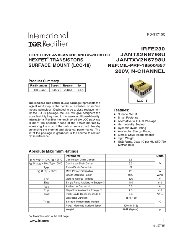 IRFE230 is a high reliability, 200V, single, N-channel MOSFET in a 18-pin LCC package. It utilizes HEXFET MOSFET technology to achieve low on-state resistance, high transconductance, and superior reverse energy and diode recovery dv/dt capability. Ideal for power supplies, motor controls, choppers, audio amplifiers, and other high-energy pulse circuit applications.