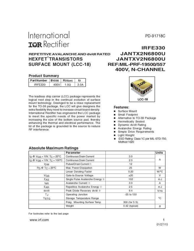 JANTXV2N6800U is a high reliability, 400V, single, N-channel MOSFET in a 18-pin LCC package. It utilizes HEXFET MOSFET technology to achieve low on-state resistance, high transconductance, and superior reverse energy and diode recovery dv/dt capability. Ideal for power supplies, motor controls, choppers, audio amplifiers, and other high-energy pulse circuit applications. It has TXV level screening and is suitable for defense applications.