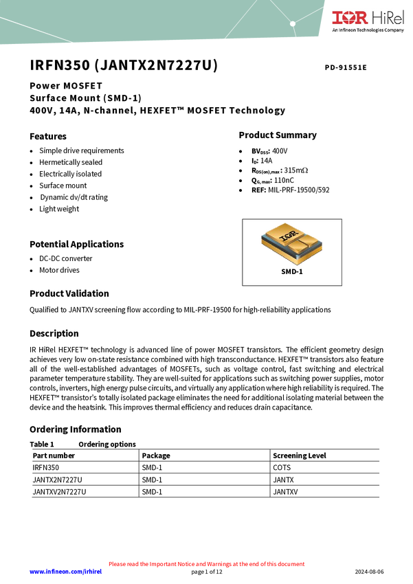 JANTXV2N7227U is a high reliability, 400V, single, N-channel MOSFET in a SMD-1 package. It utilizes HEXFET MOSFET technology to achieve low on-state resistance, high transconductance, and superior reverse energy and diode recovery dv/dt capability. Ideal for power supplies, motor controls, choppers, audio amplifiers, and other high-energy pulse circuit applications. It has TXV level screening and is suitable for defense applications.